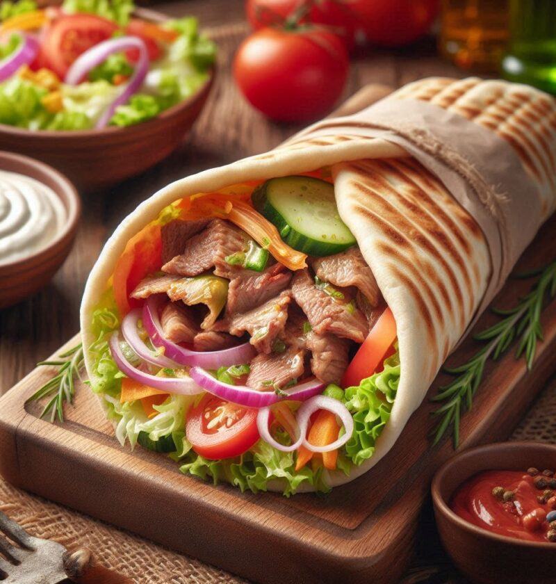 Doner kebab features spiced, marinated meat roasted on a vertical rotisserie, thinly sliced and served in flatbread with sauces and …