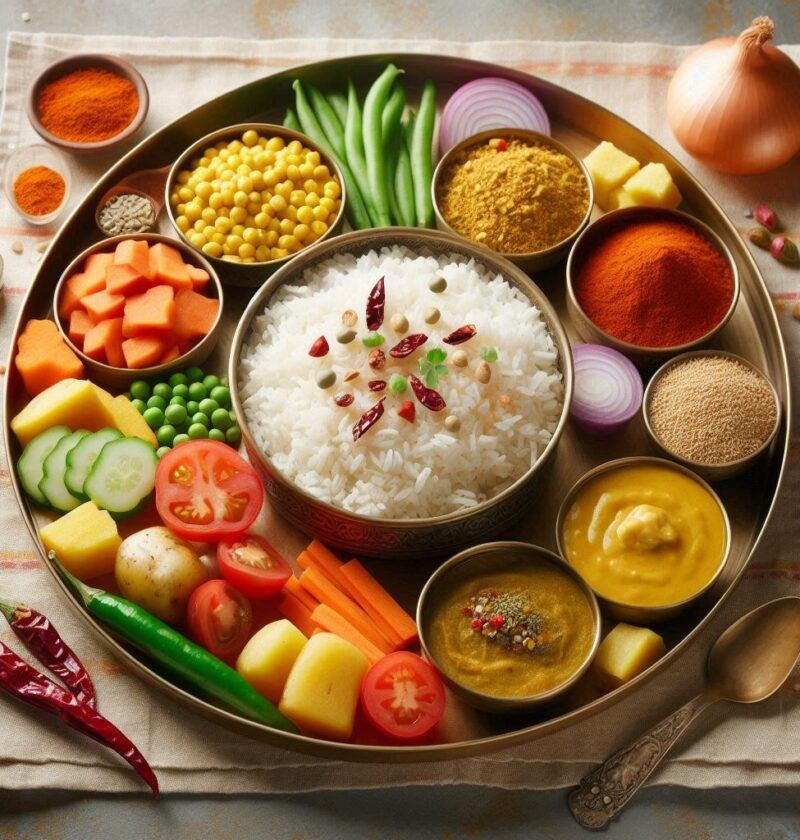 Thali is a complete Indian meal with multiple dishes, such as rice, dal, curries, pickles and bread, offering a balance …