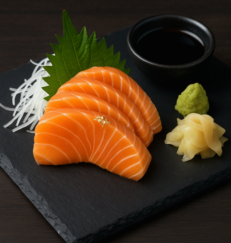 Sashimi consists of fresh, high-quality raw seafood, sliced into thin pieces and served with soy sauce, wasabi and pickled ginger.