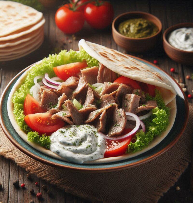 Gyros is a Greek dish made with seasoned meat, usually pork or chicken, roasted on a vertical spit, then sliced …