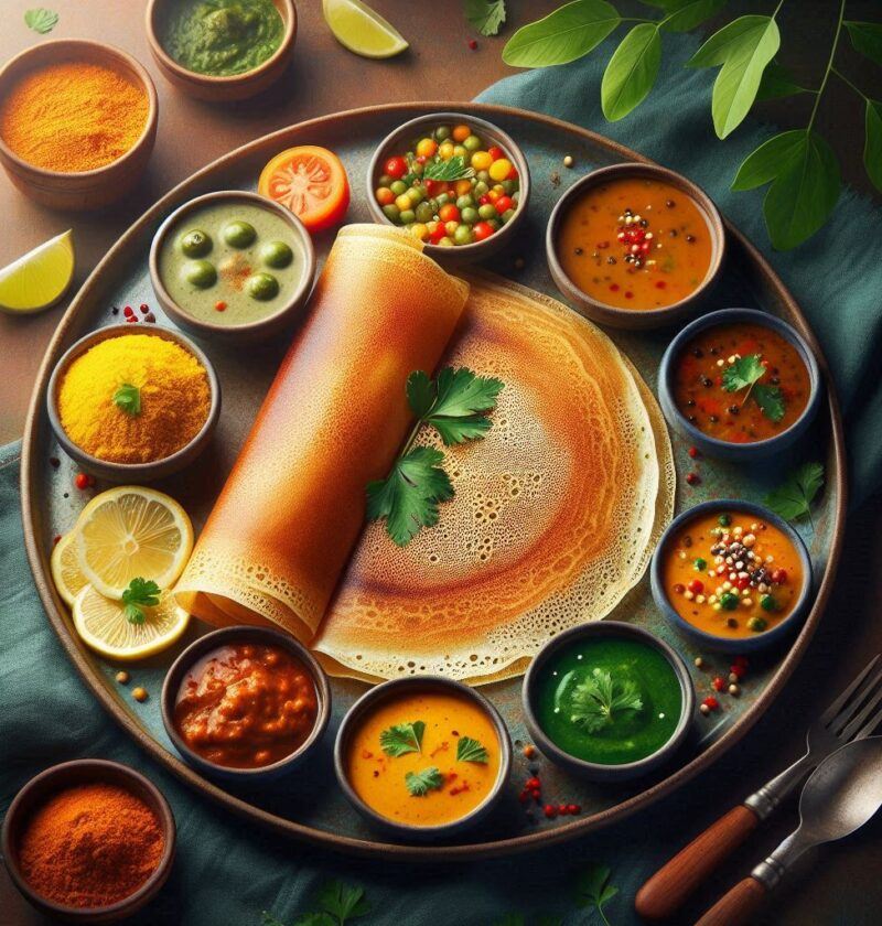 Masala Dosa is a South Indian dish featuring a fermented rice and lentil crepe filled with a spiced mashed potato …