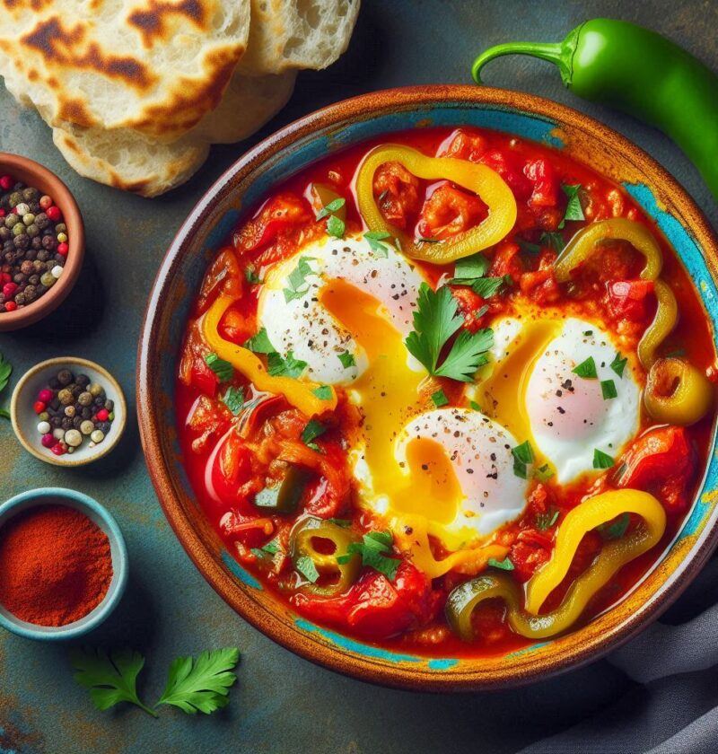 Shakshouka is a North African and Middle Eastern dish featuring eggs poached in a flavorful tomato sauce with onions, peppers …