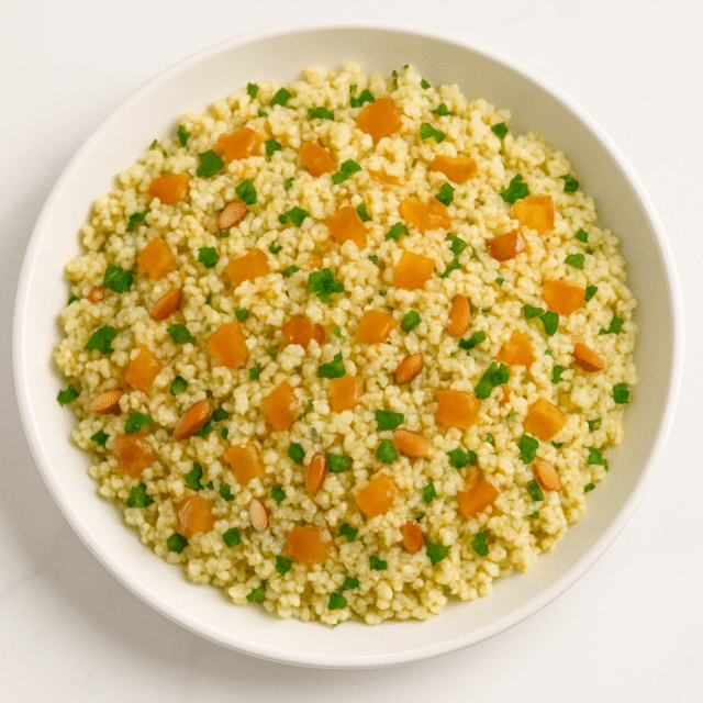 Fluff the couscous with a fork, then stir in chopped apricots, toasted almonds, olive oil, parsley and lemon zest.TIP: For extra depth, add a pinch of saffron to the couscous water.