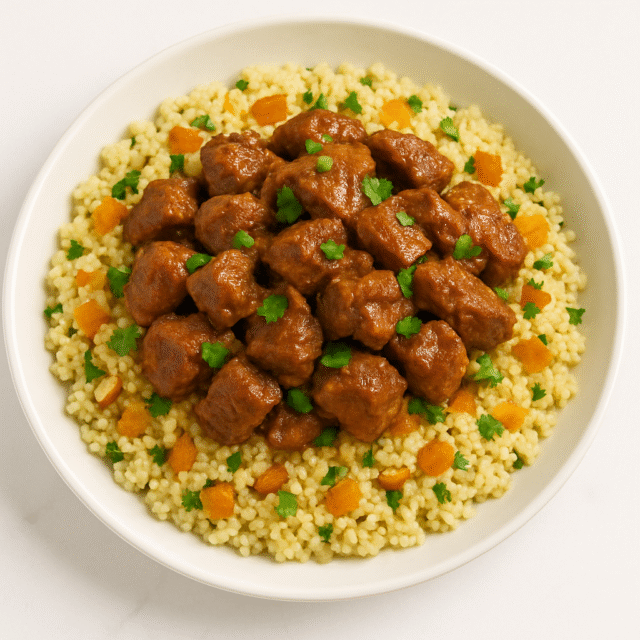 Mediterranean spiced lamb features slow-cooked meat with warm spices, served over fluffy couscous studded with apricots and toasted almonds.